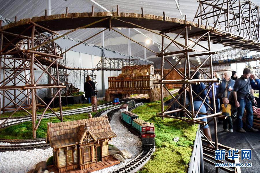 11月26日,在美國紐約植物園節(jié)日小火車展上,游客觀看模型小火車和紐約微縮景觀。新華社記者韓芳攝