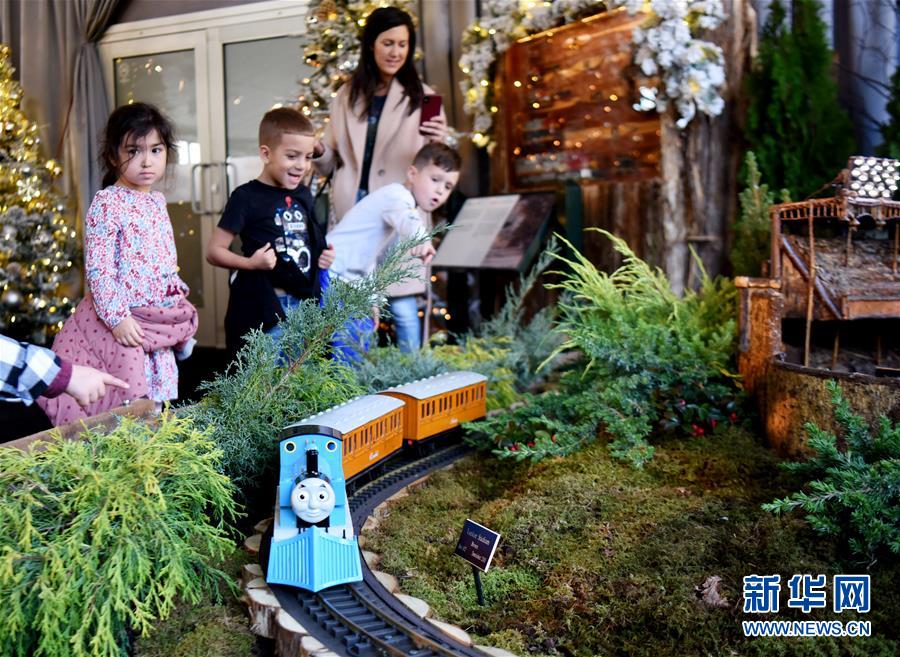 11月26日,在美國(guó)紐約植物園節(jié)日小火車展上,兒童觀看托馬斯模型小火車。新華社記者韓芳攝