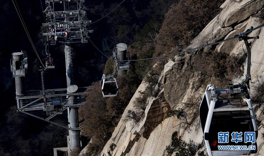 華山太華索道維修人員對(duì)索道支架及鋼絲繩進(jìn)行檢測(cè)(12月6日攝)。新華社記者陶明攝