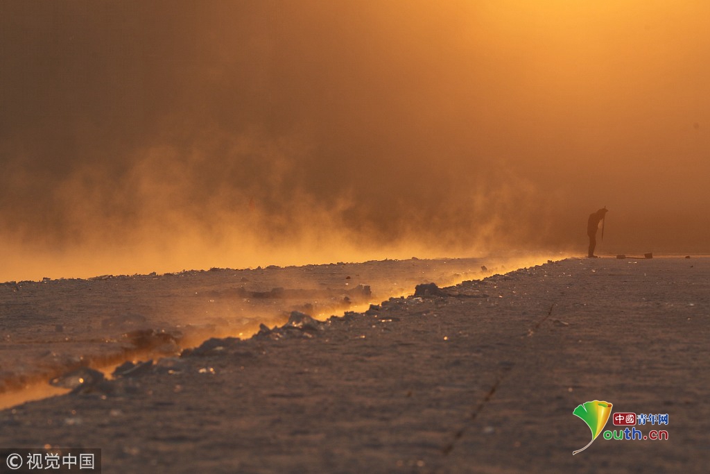 中國青年網(wǎng)2018年12月13日訊2018年12月11日,黑龍江省哈爾濱市,松花江上,采冰人在漫天霞光中破冰、采冰,金色光芒在水霧上升騰繚繞,給勞動的場面增添了詩意。
