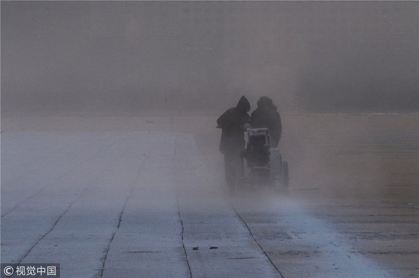 2018年12月11日,黑龍江省哈爾濱市,松花江上,采冰者們彎腰拉繩,宛如纖夫般拽重達(dá)半噸的冰塊出水。采冰者都是自哈市江北萬寶、東發(fā)、沙陀子等鄉(xiāng)鎮(zhèn)的農(nóng)民,他們每年冬閑時(shí)都會(huì)親屬、村鄰之間結(jié)伴到松花江畔采冰,有的采冰人,已經(jīng)連續(xù)干了二十多年。每個(gè)采冰季,他們每天要在冰面上工作10-12個(gè)小時(shí),每個(gè)采冰組,一天要拽出冰塊2000-3000塊,一個(gè)近20天的采冰季,每人能收入近萬元。視覺中國(guó)