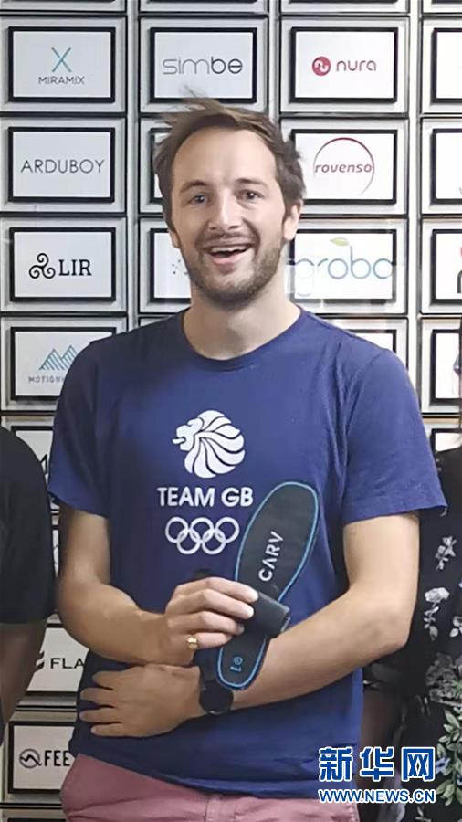 來(lái)自英國(guó)的創(chuàng)客杰米·索爾特展示自己研發(fā)的智能滑雪鞋墊(資料照片)。 新華社發(fā)