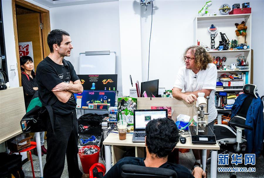 在深圳市福田區(qū)華強(qiáng)北一個(gè)創(chuàng)客孵化器內(nèi),來(lái)自荷蘭阿姆斯特丹的衛(wèi)國(guó)(右一)與來(lái)自不同國(guó)家的創(chuàng)客交流(2018年10月25日攝)。 新華社記者 毛思倩 攝