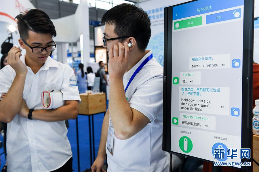 2018年11月16日,在深圳舉行的第20屆高交會(huì)上,來(lái)自深圳的年輕創(chuàng)客(右)向參觀者介紹團(tuán)隊(duì)研發(fā)的同聲傳譯耳機(jī)。 新華社記者 毛思倩 攝
