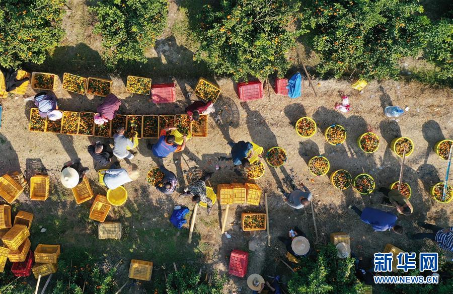 12月11日,廣西柳州市鹿寨縣四排鎮(zhèn)四排村村民在果園里將砂糖橘裝箱(無人機拍攝)。