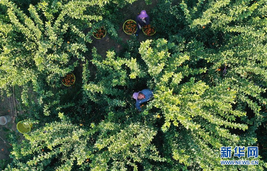 12月11日,廣西柳州市鹿寨縣四排鎮(zhèn)四排村村民在果園里采摘砂糖橘(無(wú)人機(jī)拍攝)。新華社記者 黃孝邦 攝