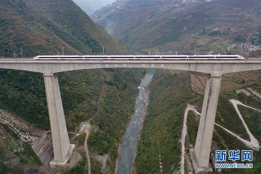 一輛成貴高鐵測(cè)試列車駛過(guò)香壩河特大橋(12月3日無(wú)人機(jī)拍攝)。新華社記者劉續(xù)攝