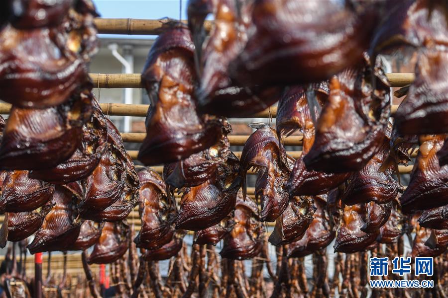 12月3日,安昌古鎮(zhèn)一家名為阿紅香腸的傳統(tǒng)臘味作坊里晾曬了各種手工制作的紹興臘味。新華社記者徐昱攝