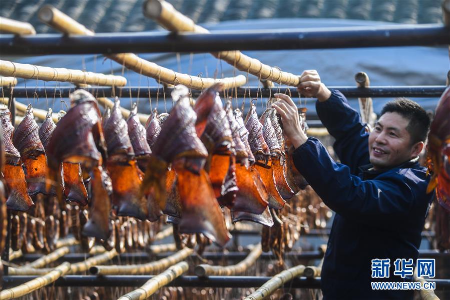 12月3日,安昌古鎮(zhèn)一家名為阿紅香腸的傳統臘味作坊里的工作人員在晾曬各種手工制作的紹興臘味。新華社記者徐昱攝
