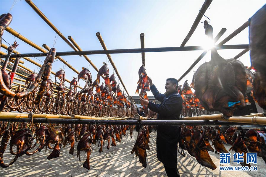 初冬時(shí)節(jié),浙江省紹興市柯橋區(qū)安昌古鎮(zhèn)開(kāi)啟了傳統(tǒng)臘味制作、上市的季節(jié)。當(dāng)?shù)匕傩沼脗鹘y(tǒng)醬油、黃酒、香料等手工腌制臘腸、醬鴨、魚(yú)干、醬鵪鶉、醬排骨等紹興特色醬貨,在冬季的陽(yáng)光下進(jìn)行晾曬,滿(mǎn)街飄香的臘味也成了這座江南古鎮(zhèn)的獨(dú)特風(fēng)景。安昌古鎮(zhèn)是浙江省歷史文化名鎮(zhèn),有著一千多年歷史,比較完善地保存了古吳越地區(qū)沿襲千百年來(lái)的民俗風(fēng)情。每年大雪節(jié)氣前后,安昌當(dāng)?shù)匕傩瞻凑諅鹘y(tǒng)習(xí)俗挑選晴朗好天氣制作、晾曬傳統(tǒng)醬貨,各類(lèi)醬貨顏色黑紅油亮,咸鮮適口,是當(dāng)?shù)囟镜奶厣珎鹘y(tǒng)美食。新華社記者徐昱攝