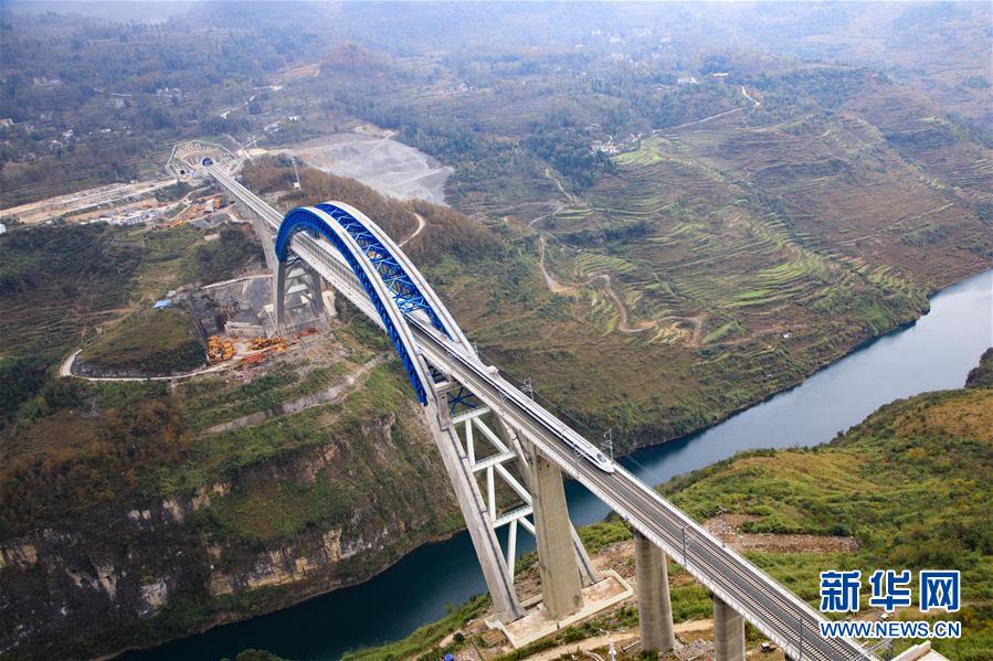 12月2日,一輛試驗(yàn)列車駛過成貴高鐵鴨池河特大橋。新華社記者劉續(xù)攝