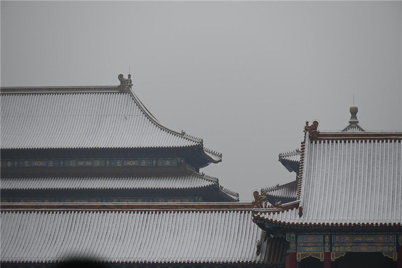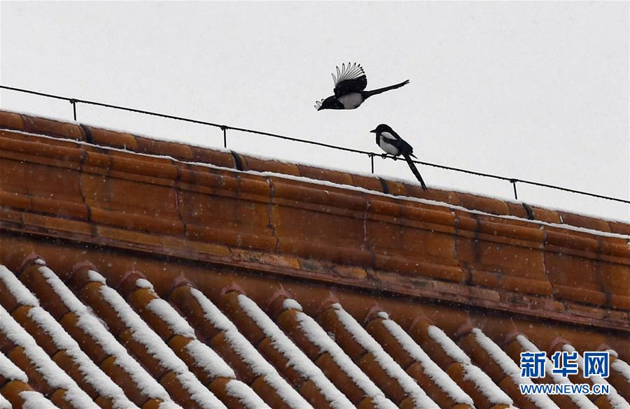 12月16日,在北京故宮,兩只喜鵲停在太和殿上。當日,北京迎來降雪天氣。新華社記者金良快攝