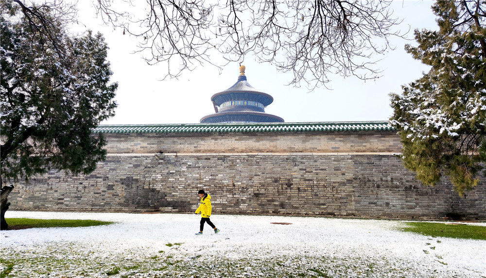 12月16日,在北京天壇公園,一名市民雪中健身。當日,北京迎來降雪天氣。新華社記者鞠煥宗攝