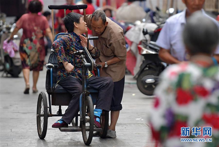 葉文娟在熊金根耳邊交代要買(mǎi)的東西(10月2日攝)。江西省南昌市西湖區(qū)繩金塔社區(qū)有一對(duì)特殊的夫妻,74歲的丈夫熊金根聽(tīng)力殘疾,67歲的妻子葉文娟患小兒麻痹癥后行動(dòng)不便。夫妻二人相互照顧相濡以沫度過(guò)了30余年。新華社記者彭昭之?dāng)z