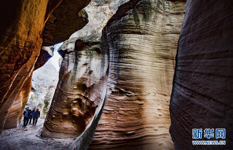 12月17日,游人在志丹縣雙河鎮(zhèn)毛項峽谷內(nèi)游覽。毛項峽谷位于陜西省延安市志丹縣雙河鎮(zhèn)毛項村,峽谷全長12公里,分為9段,曲折綿延,谷內(nèi)石壁凹凸不平,其中最窄處只能容一人側(cè)身通過,堪稱黃土高原上的自然奇觀。新華社記者陶明攝