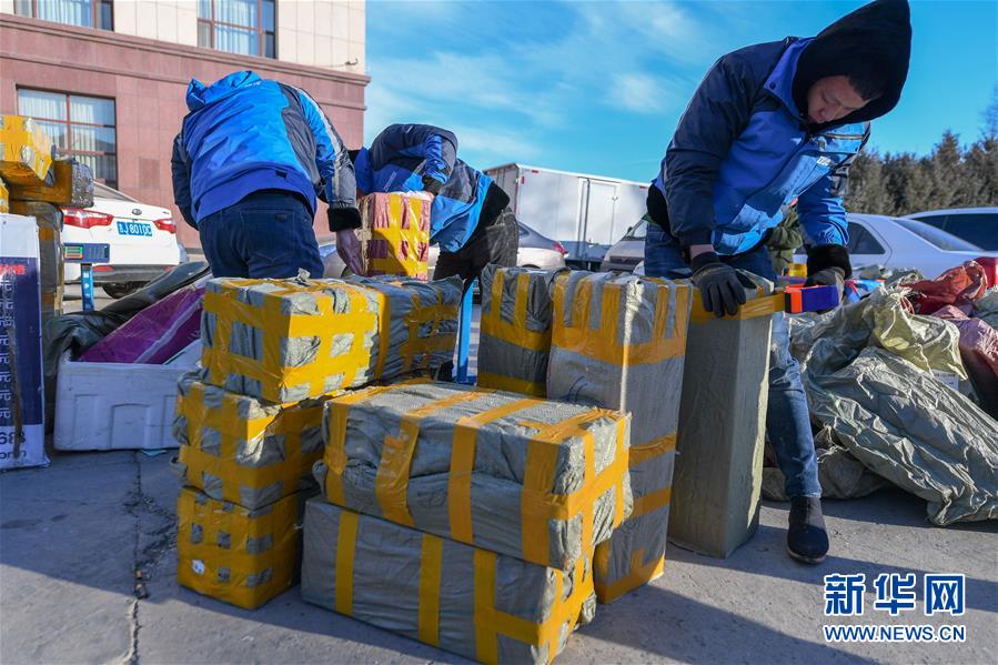 12月27日,在吉林松原查干湖漁場,快遞員將魚打包準備發(fā)給客戶。新華社記者張楠攝
