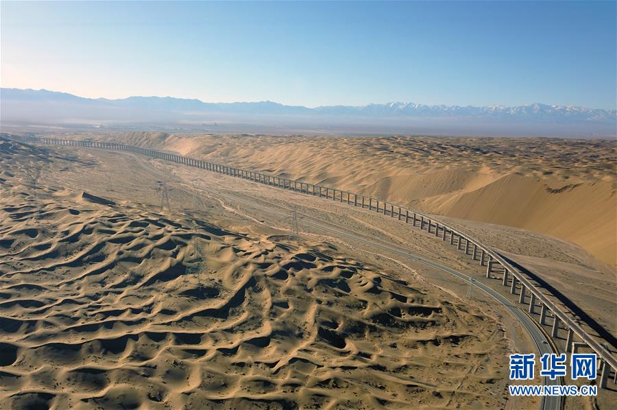 這是敦格鐵路沙山溝特大橋(12月11日無人機(jī)拍攝)。 敦(煌)格(爾木)鐵路沙山溝特大橋位于甘肅省酒泉市阿克塞哈薩克族自治縣境內(nèi)的庫(kù)姆塔格沙漠內(nèi),是一座穿越活動(dòng)性沙漠地區(qū)的特長(zhǎng)橋梁,也是敦格鐵路的重難點(diǎn)控制工程。據(jù)介紹,橋梁所在區(qū)域風(fēng)沙活動(dòng)頻繁,四季及晝夜溫差大,在建設(shè)過程中,中鐵十一局集團(tuán)有限公司的建設(shè)者根據(jù)沙層的厚度、分布及含水率的不同,總結(jié)出一套沙丘樁基施工工藝。 新華社記者 范培珅 攝