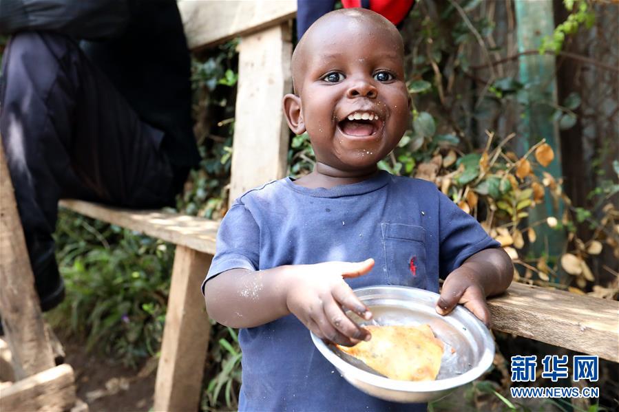 2019年9月1日,在肯尼亞內(nèi)羅畢的一個(gè)街邊攤位,一名兒童品嘗薩摩薩??夏醽喖皷|非地區(qū)的傳統(tǒng)面食薩摩薩是一種三角形的油酥點(diǎn)心,由薄面皮包裹豆類、蔬菜及牛羊肉餡后,下鍋油炸而成。 新華社記者 王騰 攝