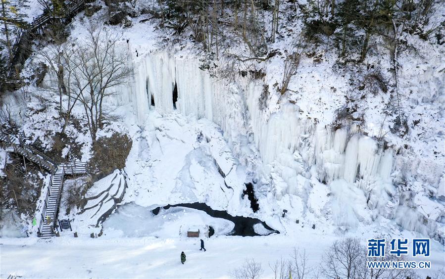 游人在吉林省長白縣十五道溝望天鵝景區(qū)觀賞冰瀑景觀(1月3日無人機拍攝)。新華社記者許暢攝