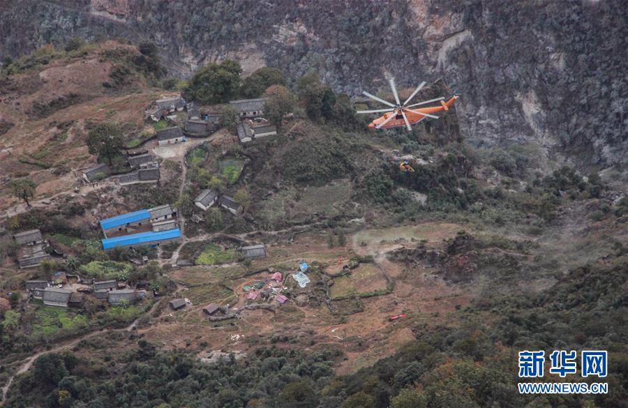 米-26重型直升機(jī)吊運(yùn)一臺(tái)挖掘機(jī)飛抵阿布洛哈村上空(2019年12月3日攝)。通村公路的施工單位四川路橋租用一架米-26重型運(yùn)輸直升機(jī),克服高山峽谷、天氣多變等不利因素,從布拖縣城吊運(yùn)大型施工設(shè)備到阿布洛哈村,為兩邊分頭掘進(jìn)施工提供大型機(jī)械保障。新華社記者江宏景攝