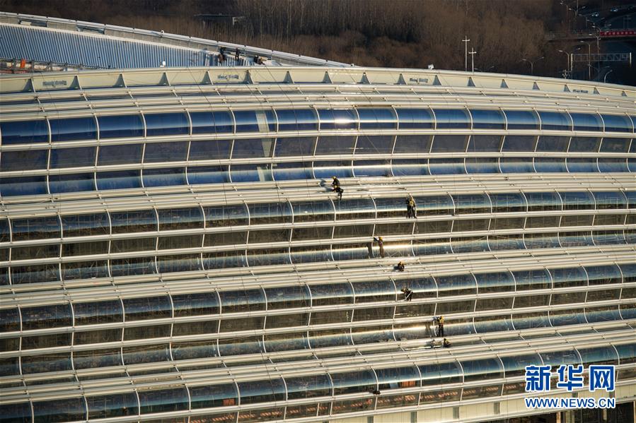 12月31日,施工人員在實(shí)現(xiàn)封頂封圍的國(guó)家速滑館現(xiàn)場(chǎng)工作。新華社記者鞠煥宗攝