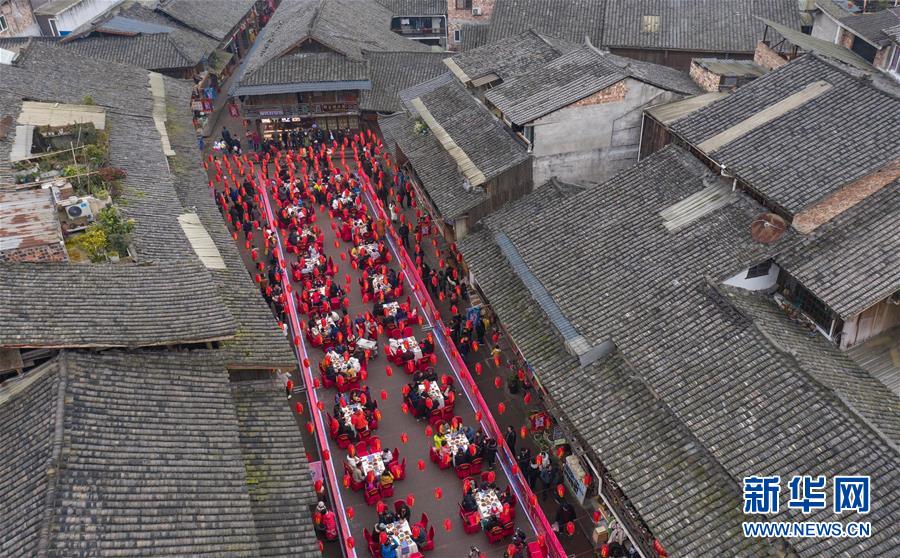 1月1日,在四川省雅安市上里古鎮(zhèn),人們在享用年豬宴(無人機照片)。新華社記者 江宏景 攝
