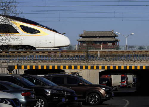 2019年1月25日,一列“復(fù)興號”動(dòng)車組列車在北京永定門城樓附近的京津城際鐵路上行駛。新華社記者邢廣利攝