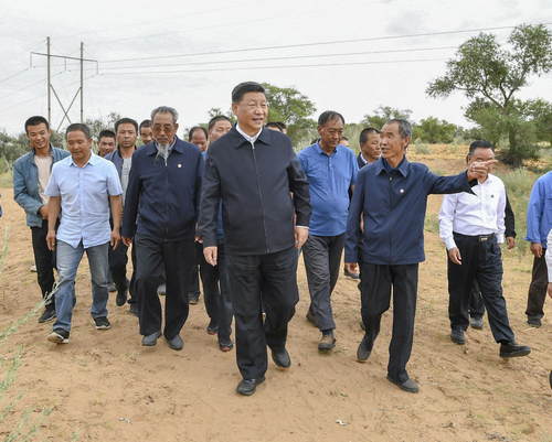 2019年8月19日至22日,中共中央總書記、國家主席、中央軍委主席習(xí)近平在甘肅考察。這是21日上午,習(xí)近平在武威市古浪縣八步沙林場察看林場整體風(fēng)貌,聽取武威市防沙治沙整體情況匯報(bào)和八步沙林場“六老漢”三代人治沙造林的感人事跡。新華社記者謝環(huán)馳攝