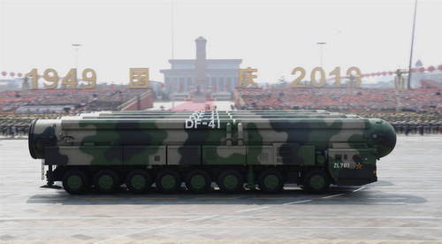 2019年10月1日,慶祝中華人民共和國成立70周年大會(huì)在北京天安門廣場隆重舉行。這是東風(fēng)-41核導(dǎo)彈方隊(duì)接受檢閱。新華社記者劉彬攝