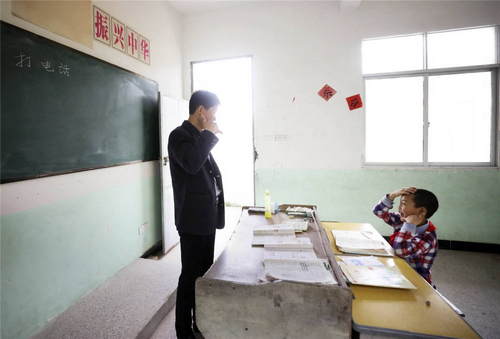 2019年5月8日,王北海(左)在教室內(nèi)為陳威宇講解“打電話”的流程。江西省瑞金市大柏地鄉(xiāng)三河小學(xué)坐落于大山深處,老師王北海陪伴著他唯一的學(xué)生陳威宇。新華社記者蘭紅光攝