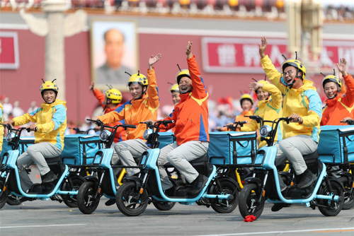 2019年10月1日,慶祝中華人民共和國成立70周年大會(huì)在北京天安門廣場隆重舉行。這是群眾游行中的與時(shí)俱進(jìn)方陣。新華社記者歐東衢攝