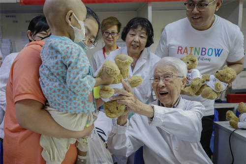 2019年5月31日,北京兒童醫(yī)院百歲兒科醫(yī)生張金哲(前右)在北京關(guān)愛惡性實(shí)體腫瘤患兒公益活動(dòng)上向住院的孩子贈(zèng)送兒童節(jié)禮物。新華社記者張玉薇攝