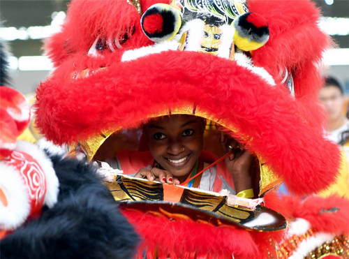2019年10月28日,來自印度洋島國科摩羅的拉一莎在河南省鄭州西亞斯學(xué)院體驗(yàn)舞獅。新華社記者李嘉南攝
