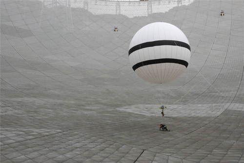 2019年8月30日,在貴州省平塘縣,“微重力蜘蛛人”在500米口徑球面射電望遠(yuǎn)鏡(FAST)上進(jìn)行首次巡檢實(shí)驗(yàn)。FAST調(diào)試組于2017年底開始研制“微重力蜘蛛人”,該方案使用一個(gè)直徑7.6米的氦氣球?qū)⒆鳂I(yè)人員體重減少到FAST反射面板能夠承受的重量,使作業(yè)者能夠到達(dá)望遠(yuǎn)鏡反射面任意地方執(zhí)行巡檢和維護(hù)作業(yè)。新華社記者歐東衢攝