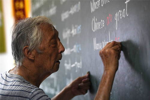 2019年7月30日,葉連平在“留守未成年人之家”教室里為第二天的英語課準(zhǔn)備板書。暑期伊始,在安徽省和縣烏江鎮(zhèn)卜陳村“留守未成年人之家”,92歲的退休教師葉連平又開始了暑假的忙碌。新華社發(fā)(黃博涵 攝)