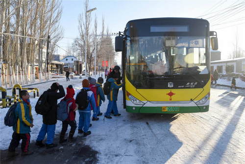 2019年12月18日,在新疆伊犁哈薩克自治州察布查爾錫伯自治縣海努克鄉(xiāng)阿熱吾斯塘村小學(xué),學(xué)生排隊登上“校車專線”。新華社記者丁磊攝