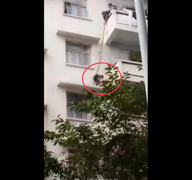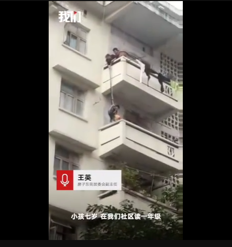小男孩被大人們用繩子系著腰,晃晃悠悠地吊下三樓遮雨平臺后,勇敢地走向貓,將其抱起,接著又被5樓的奶奶等人晃晃悠悠地吊起往上拉,小男孩全程表情木然,絲毫未見緊張害怕。萬幸的是,最終男孩平安并順利完成任務(wù)。