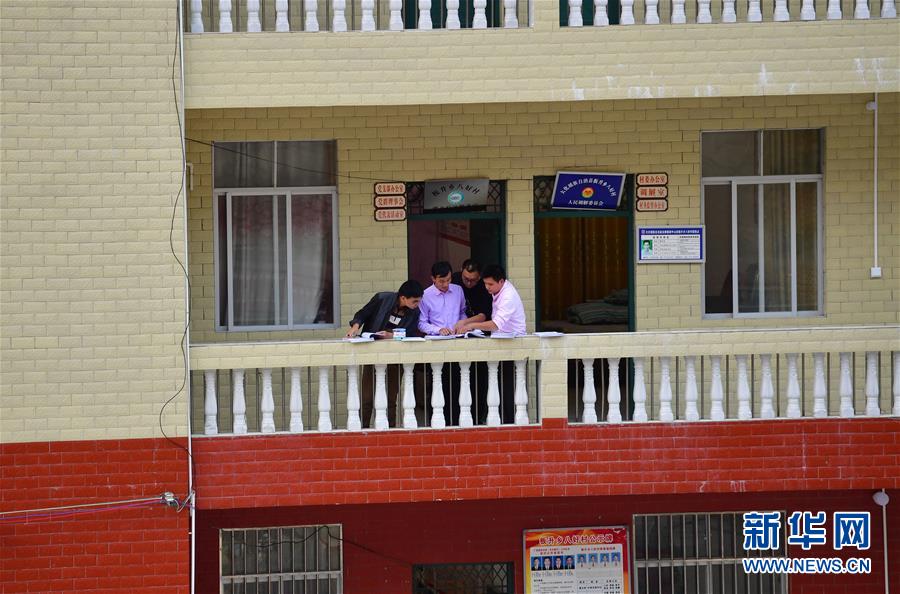 八好村駐村第一書記韋德王(左二)和同事在辦公樓里討論工作(2019年11月12日攝)。新華社記者黃孝邦攝