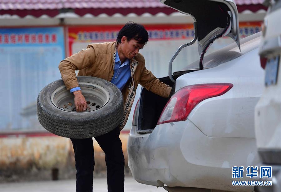 八好村駐村第一書記韋德王將汽車備胎放入后備箱(2019年12月16日攝)。新華社記者黃孝邦攝