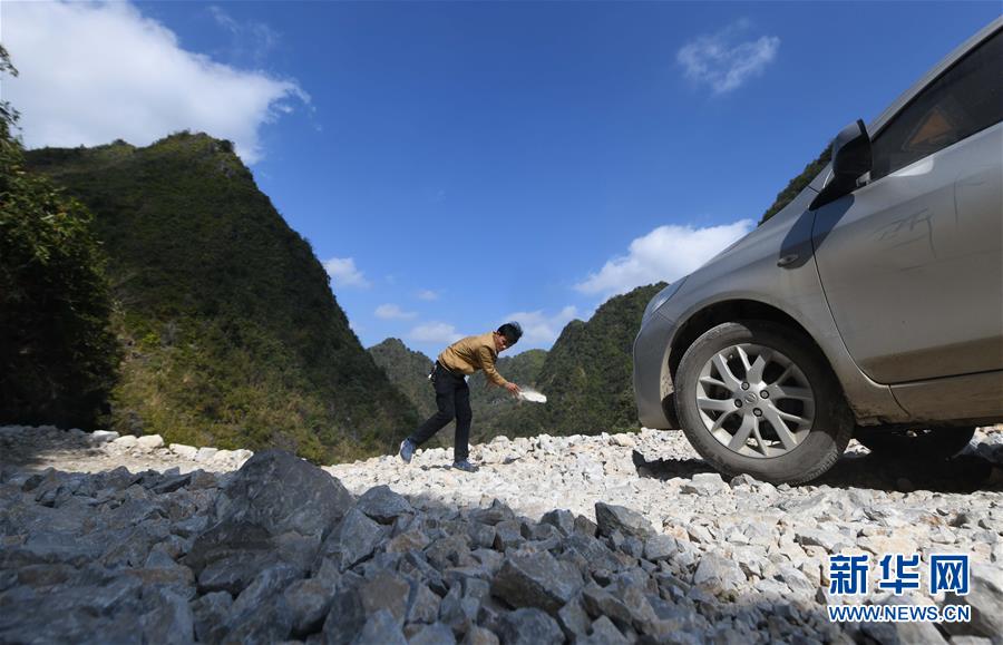 八好村弄豪屯的砂石路剛剛修通,碎石多、路況差,駐村第一書(shū)記韋德王駕車(chē)下屯途中,經(jīng)常要下車(chē)將大石塊搬走(2019年12月16日攝)。新華社記者黃孝邦攝