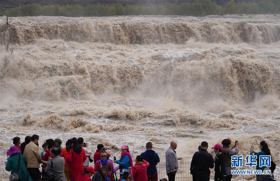 受近日降雨影響,位于山西吉縣的壺口瀑布水量增大,壯美的瀑布群景觀吸引眾多游客前來觀賞。新華社記者楊晨光攝
