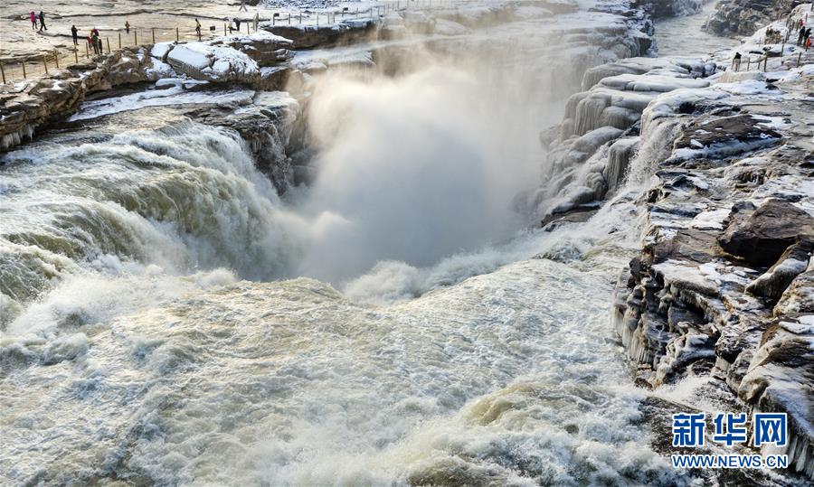 1月12日拍攝的黃河壺口瀑布的“水底冒煙”景觀(無人機照片)。新華社記者陶明攝