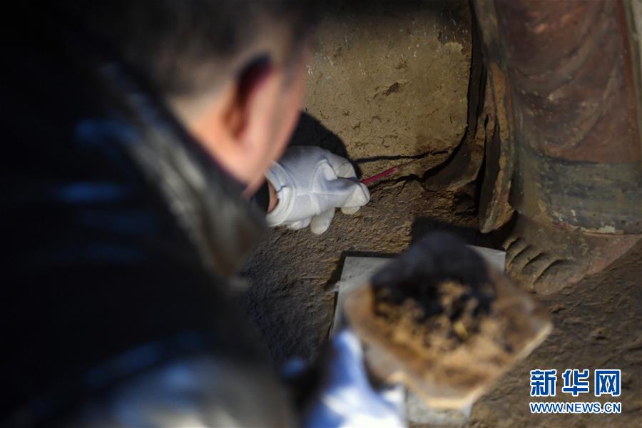 12月25日,在麥積山石窟第11窟,修復(fù)師牟常有對(duì)塑像破損處進(jìn)行加固處理。