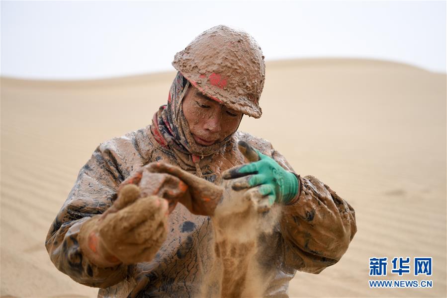1月13日,鉆井工潘洪星用沙子帶出手套里的泥水。地球物理勘探是油氣開(kāi)發(fā)的第一步,相當(dāng)于給地球做CT。物探工人按照嚴(yán)格的測(cè)線部署,在相應(yīng)位置鉆井,然后實(shí)施地震,采集地震波數(shù)據(jù)??蒲腥藛T通過(guò)數(shù)據(jù)組成的“CT片”,就能夠清晰地“看”到地下的地質(zhì)結(jié)構(gòu),判斷哪里埋藏有石油或者天然氣。2019年10月,東方地球物理勘探有限責(zé)任公司塔里木物探處2113隊(duì)進(jìn)入新疆塔克拉瑪干沙漠腹地,開(kāi)始中古14-21、塔中2兩個(gè)區(qū)塊的三維地震勘探。近2000名物探工人將在1000平方公里的范圍內(nèi)一直工作到2020年4月,這也意味著他們將在塔克拉瑪干沙漠腹地連續(xù)度過(guò)第14個(gè)除夕夜。蘊(yùn)藏著豐富石油天然氣資源的新疆塔克拉瑪干沙漠有“死亡之?!敝Q,氣候干燥,年降水量在50毫米以下,冬季地表最低溫度超過(guò)零下30攝氏度,是世界油氣勘探難度最大的地區(qū)之一。為避開(kāi)風(fēng)季,物探工人每年9、10月份進(jìn)入沙漠,一直工作到來(lái)年4月,夜以繼日與黃沙、嚴(yán)寒為伴,用辛勤的汗水,為祖國(guó)找油找氣。新華社記者丁磊攝