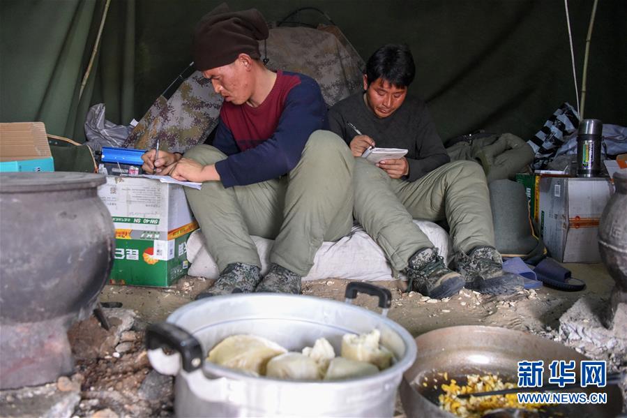 1月14日,查線工在吃飯間隙收聽電臺里報出的不正常道樁號,并記錄在本子上。地球物理勘探是油氣開發(fā)的第一步,相當(dāng)于給地球做CT。物探工人按照嚴(yán)格的測線部署,在相應(yīng)位置鉆井,然后實(shí)施地震,采集地震波數(shù)據(jù)??蒲腥藛T通過數(shù)據(jù)組成的“CT片”,就能夠清晰地“看”到地下的地質(zhì)結(jié)構(gòu),判斷哪里埋藏有石油或者天然氣。2019年10月,東方地球物理勘探有限責(zé)任公司塔里木物探處2113隊(duì)進(jìn)入新疆塔克拉瑪干沙漠腹地,開始中古14-21、塔中2兩個區(qū)塊的三維地震勘探。近2000名物探工人將在1000平方公里的范圍內(nèi)一直工作到2020年4月,這也意味著他們將在塔克拉瑪干沙漠腹地連續(xù)度過第14個除夕夜。蘊(yùn)藏著豐富石油天然氣資源的新疆塔克拉瑪干沙漠有“死亡之?!敝Q,氣候干燥,年降水量在50毫米以下,冬季地表最低溫度超過零下30攝氏度,是世界油氣勘探難度最大的地區(qū)之一。為避開風(fēng)季,物探工人每年9、10月份進(jìn)入沙漠,一直工作到來年4月,夜以繼日與黃沙、嚴(yán)寒為伴,用辛勤的汗水,為祖國找油找氣。新華社記者丁磊攝
