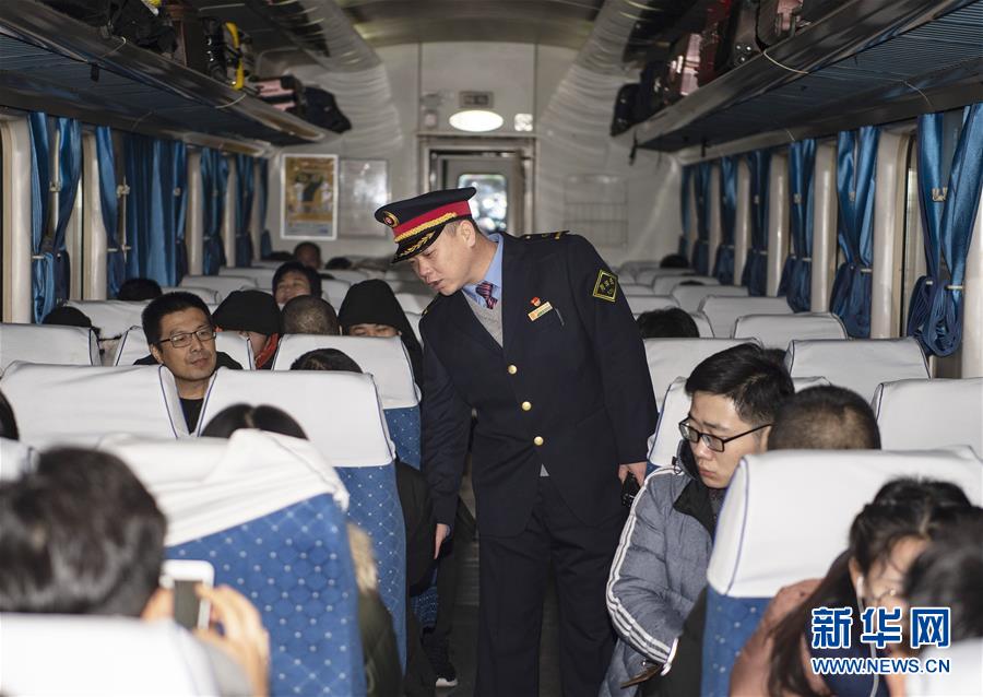 1月11日,在太原開往青島北的K884次列車上,列車長趙耀了解旅客要求。新華社記者 楊晨光 攝