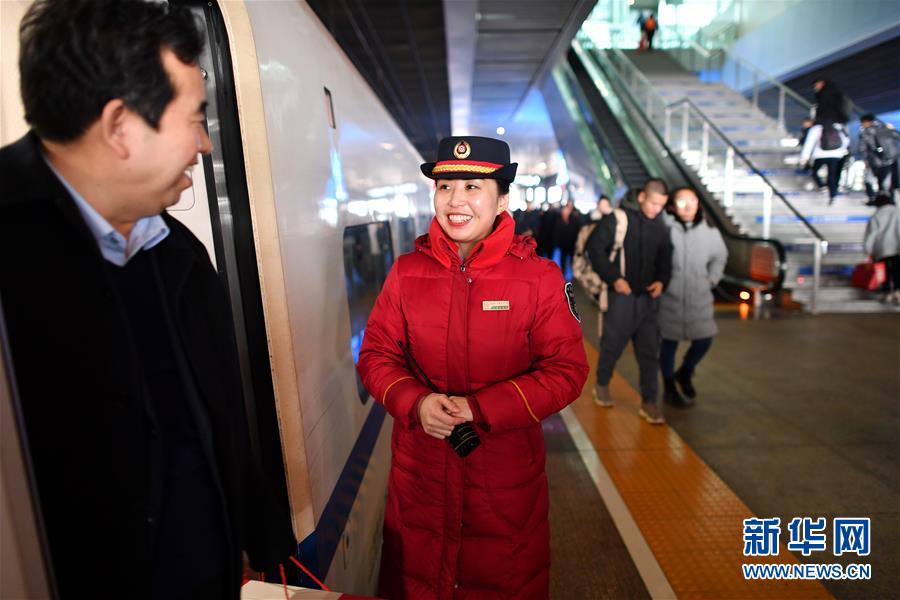 1月11日,在西安北站,列車長陳海燕在站臺(tái)上目送旅客下車。新華社記者 詹彥 攝