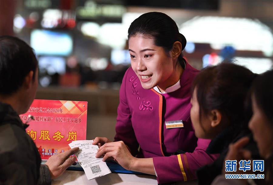 吉如在西安北站咨詢服務(wù)臺(tái)解答旅客的問題(1月15日攝)。 新華社記者 陶明 攝