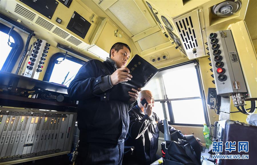 機(jī)車司機(jī)杜洪峰(右)與副司機(jī)謝振國進(jìn)行開車前的例行檢查(1月17日攝)。新華社記者 許暢 攝