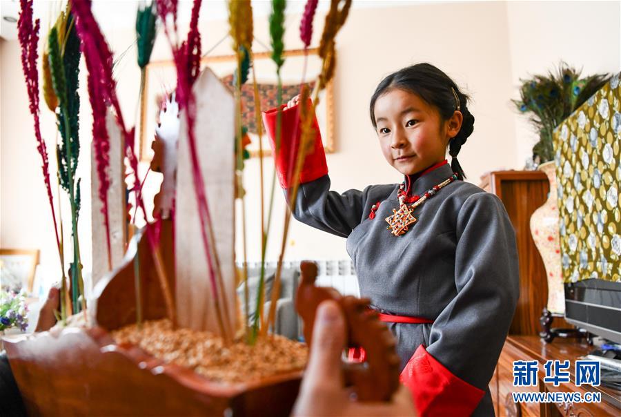 一名身著藏裝的藏族小姑娘在吃切瑪(2月24日攝)。 當日是藏歷新年初一,西藏各地群眾歡度藏歷新年。受新冠肺炎疫情影響,當?shù)靥岢娫挵菽?、少出門、不聚集,居家享受新年樂趣。  新華社記者 晉美多吉 攝